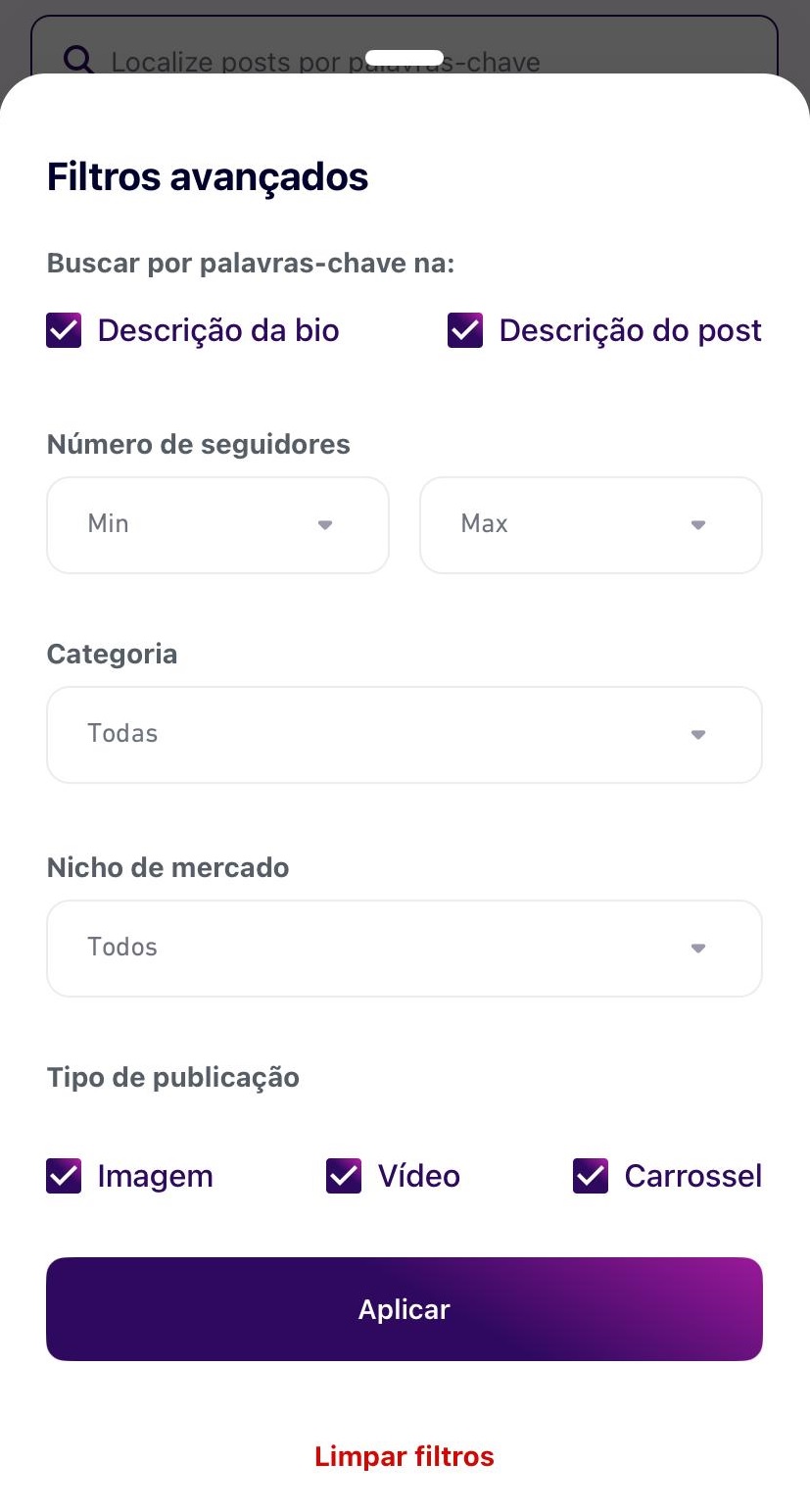 Logo abaixo você tem o botão de Filtros Avançados que apresenta ainda mais opções para você refinar a sua pesquisa. Nele você pode escolher onde a pesquisa de palavra-chave vai acontecer, na descrição da bio ou na descrição do post, você pode deixar os 2 ativados para aumentar a quantidade de resultados**.**